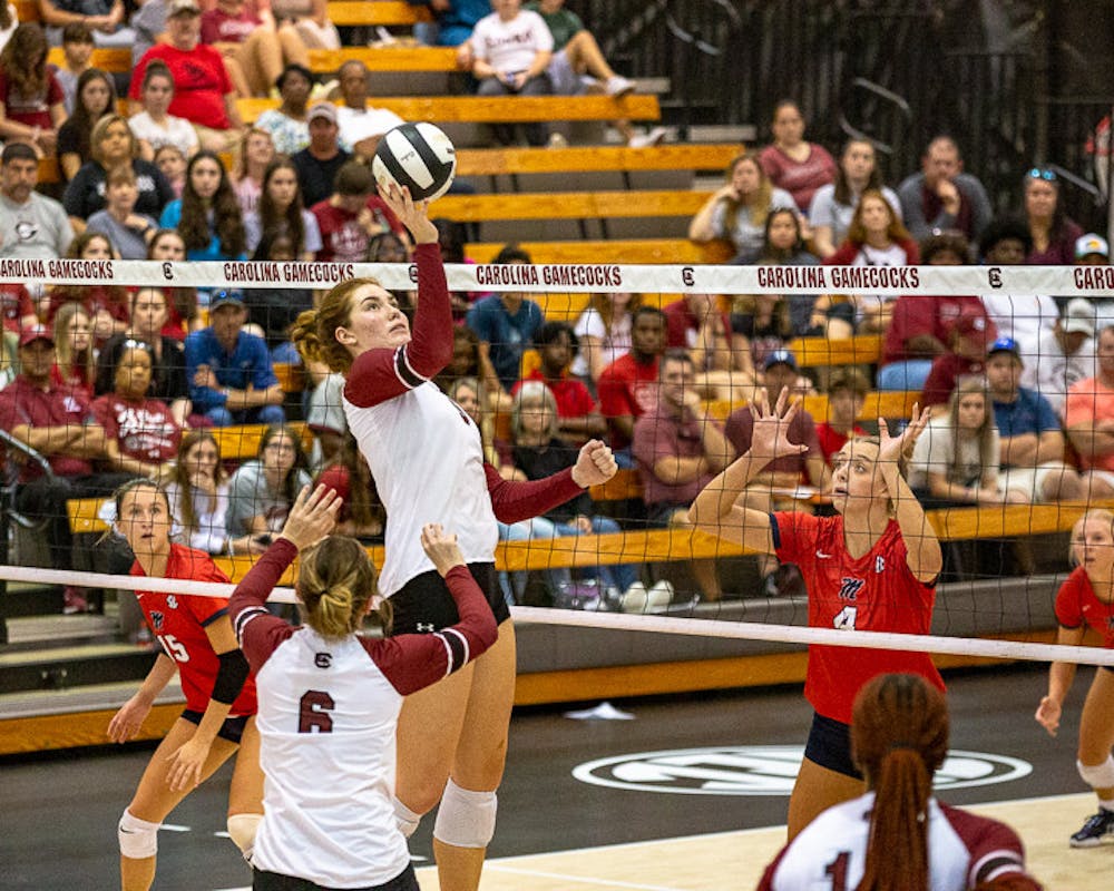 Junior middle blocker Ellie Ruprich spikes the ball during the South Carolina and Ole Miss matchup on Nov. 5, 2022. The Rebels beat the Gamecocks 3-1.