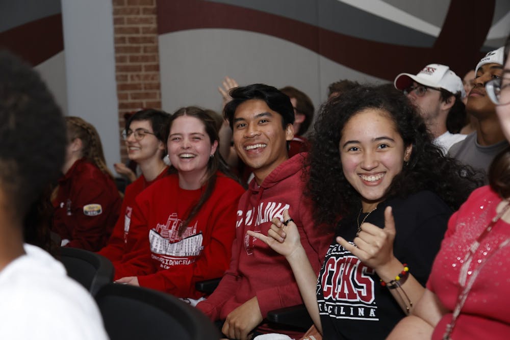 South Carolina students cheer on the women’s basketball team at a watch party in the Russell House Theater on April 3, 2022. The watch party was hosted by Gamecock Entertainment.