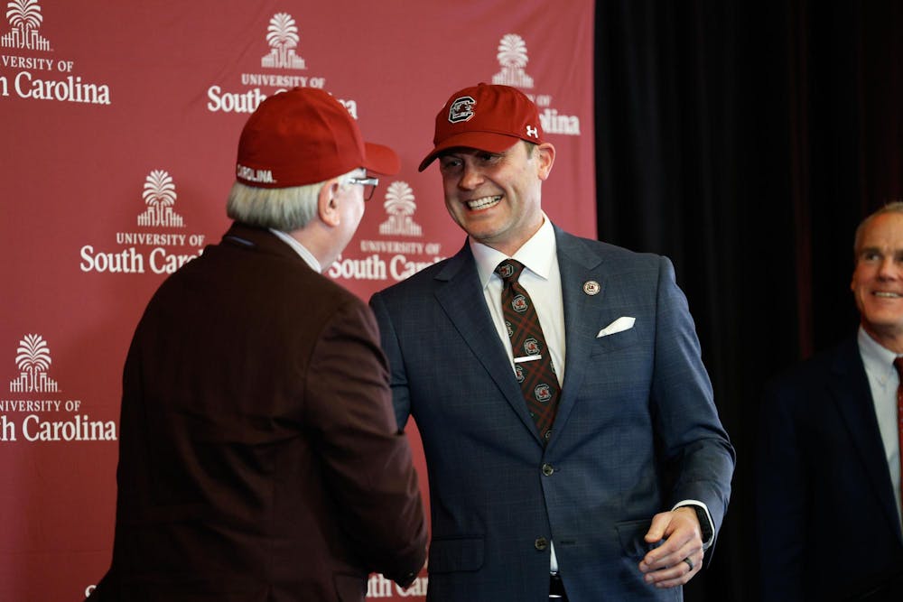 New South Carolina Athletics Director Jeremiah Donati shakes hands with USC President Michael Amiridis after a press conference at The Zone on Dec. 5, 2024. Donati is interested in better engaging with the student body and driving revenue.