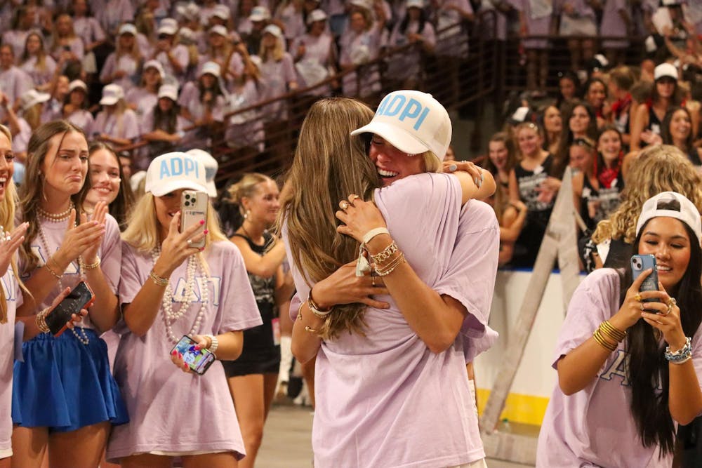 A member of Alpha Delta Pi greets a PNM with an embrace on bid day Aug. 25, 2024 at Colonial Life Arena. The arena was full of excitement as many sprinted to find their new home.