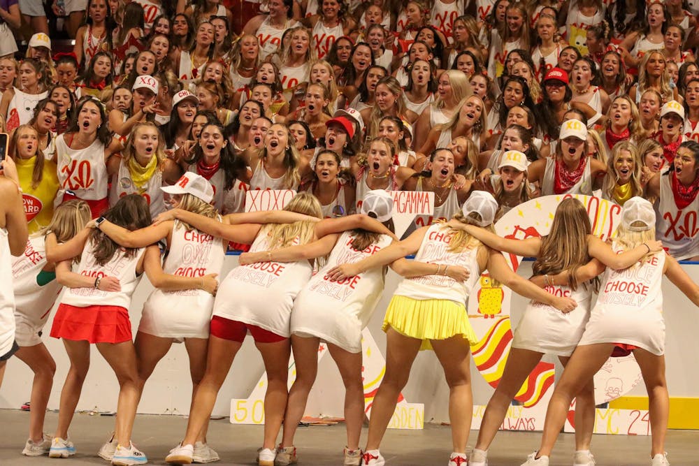 Members of Chi Omega cheer as they wait for their new members to arrive at Colonial Life Arena for bid day on Aug. 25, 2024. The chapters were excited to finally welcome the latest members of their sorority.