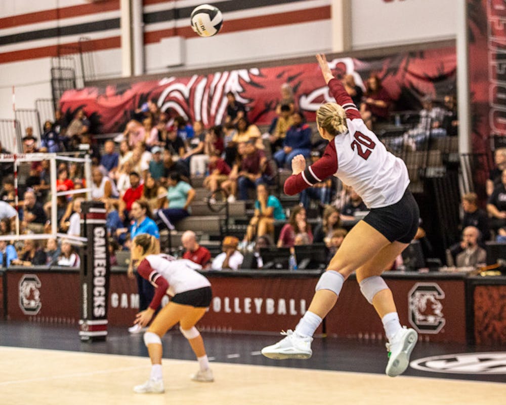 Junior outside hitter Riley Whitesides serves the ball at the South Carolina and Ole Miss matchup on Nov. 5, 2022. Ole Miss bested South Carolina 3-1.