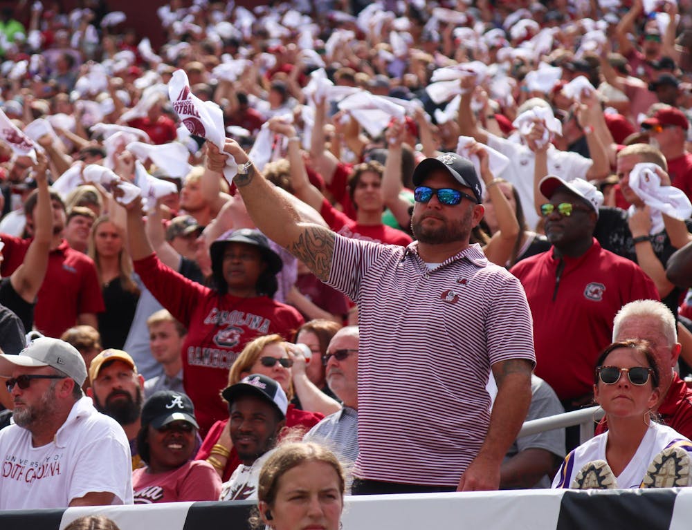 Gamecocks fans participate in the tradition of the Sandstorm on Sept. 14, 2024, at Williams-Brice Stadium. Many fans stayed till the end of the sold-out game, cheering loudly waving around their white rally towels.