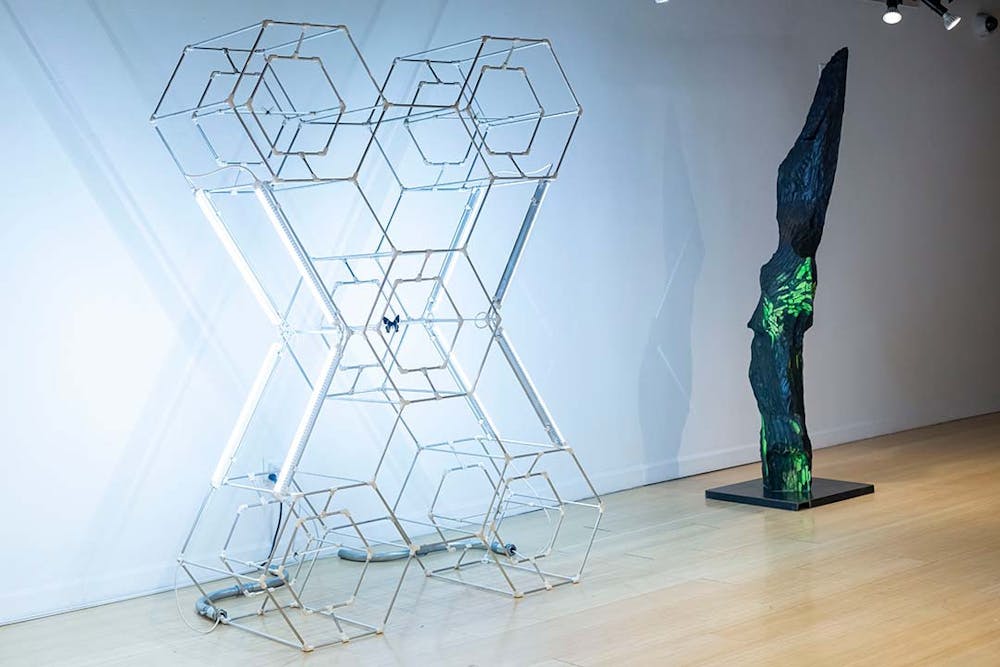 "Anthropocene Hex Sign" (left) and "Fear of the Unknown: Haunting Abstraction" (right) by Eli Kessler both focus on the juxtaposition between humanity and nature. Both works use a combination of natural elements and industrial parts to express the tension between the two.