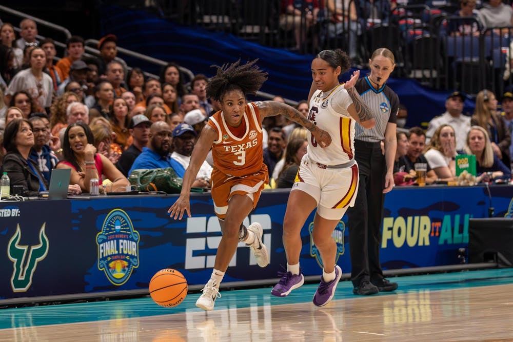 Senior guard Te-Hina Paopao defends a Texas player in transition on April 4, 2025 at Amalie Arena. Paopao led the Gamecocks in scoring, with a total of 14 points in 25 minutes played.