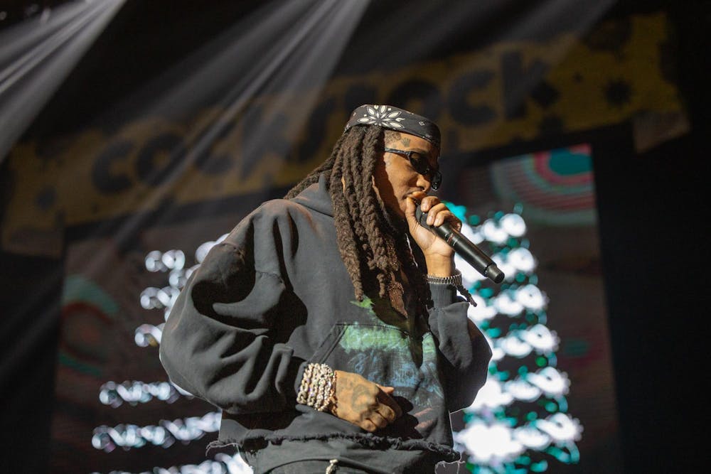 Quavo, a rapper and singer, sings into the microphone while performing one of his songs at Colonial Life Arena on Jan. 29, 2025. The artist, most known for his lead role in the group the Migos, has also performed on big hits with other artists, such as Post Malone and Drake.