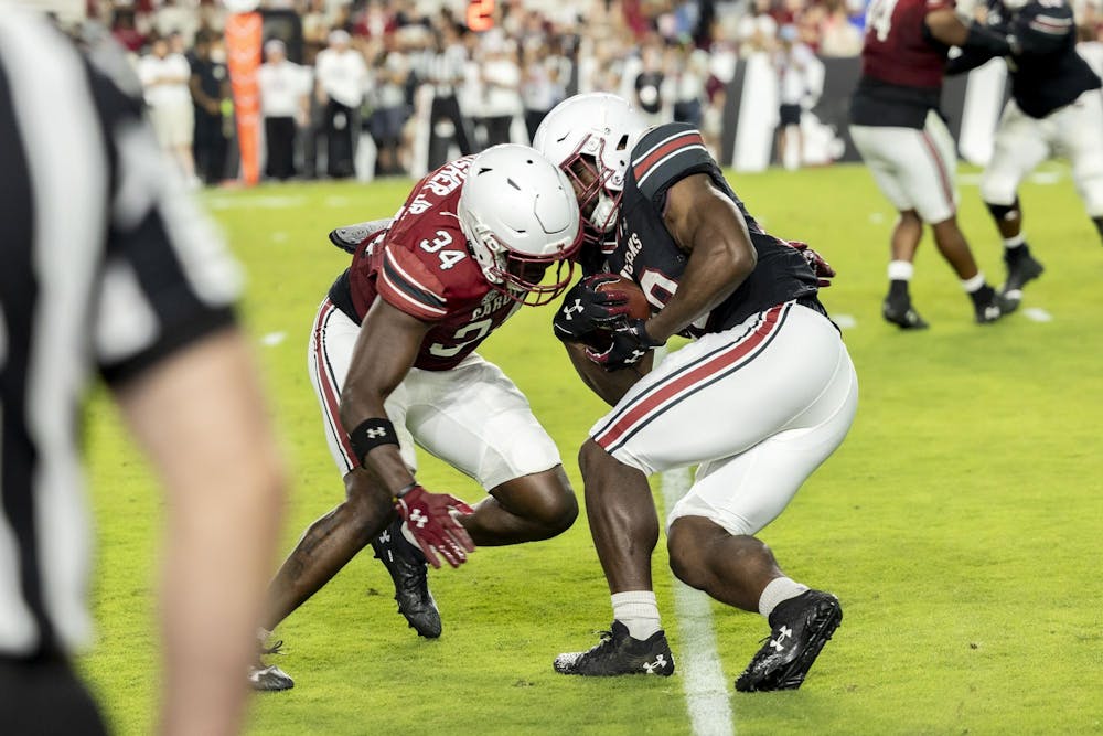 Redshirt junior linebacker Jamian Risher Jr. defends freshman wide receiver Brian Rowe Jr. during the 2025 spring game at Williams Brice Stadium on Friday, April 18, 2025. Rowe enrolled at USC in January after graduating from Jam M. Robinson High School where he totaled 120 catches during three seasons.