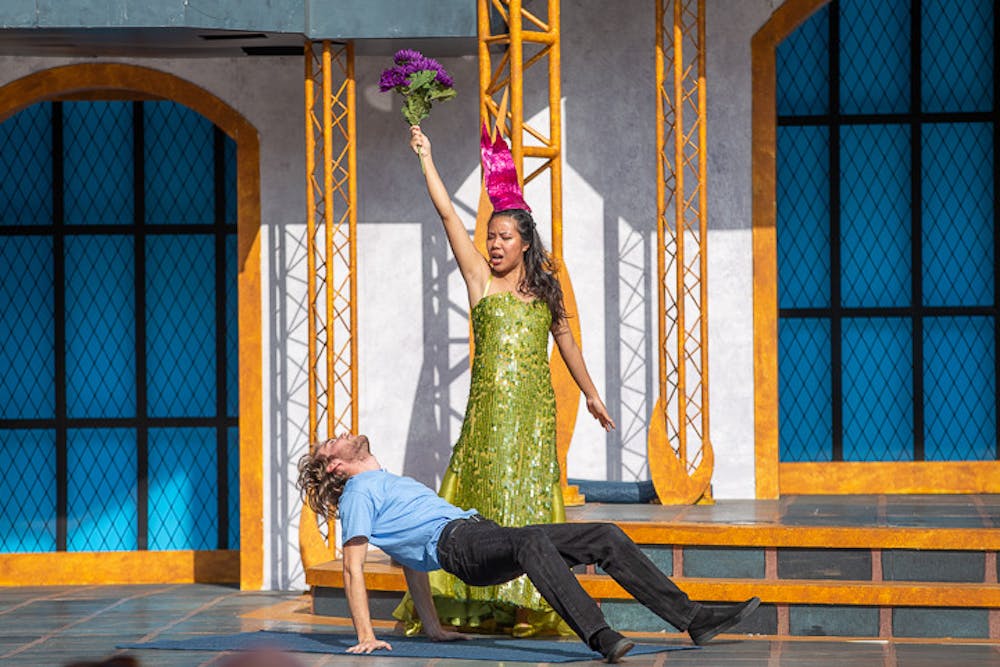 Titania, portrayed by fourth-year hospitality and tourism student Zoe Chan enchants Demetrius, portrayed by fourth-year film and media studies student Rayne Norris during the showing of "A Midsummer Night's Dream" on Oct. 9, 2022. USC Department of Theatre and Dance held the play from October 2 to 9, 2022.