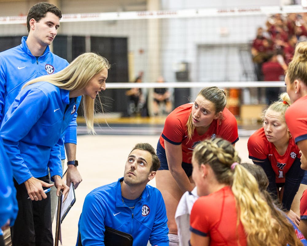 Ole Miss acting head coach Bre Henry talks to the team during a timeout in the second half of its matchup against South Carolina on Nov. 5, 2022. The Rebels beat the Gamecocks 3-1.