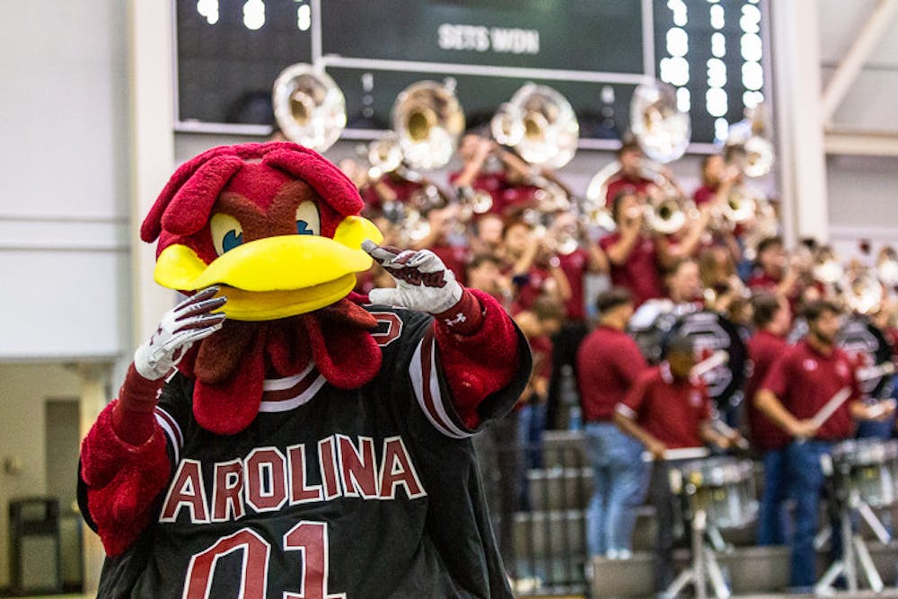 Cocky dances during the South Carolina band's performance at the matchup against Ole Miss on Nov. 5, 2022. The band acts as a moral boost for the players as fans, getting the crowd hyped between plays.