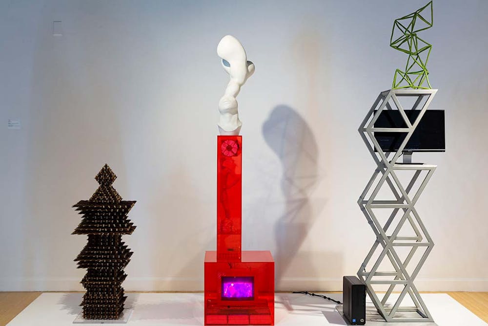 "The Thorn" (left), "The Side" (center) and "The Pleasure Principle" (right) by Eli Kessler. All three pieces comment on the underlying psychology of American folk art, 1980s pop culture and contemporary society.
