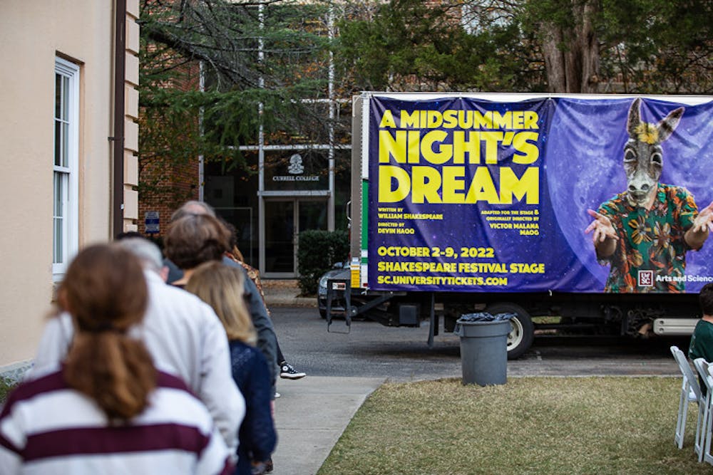 Spectators wait in line for hors d'oeuvres prior to the final showing of "A Midsummer Night's Dream" on Oct. 9, 2022. USC Department of Theatre and Dance held the play from October 2 to 9, 2022.