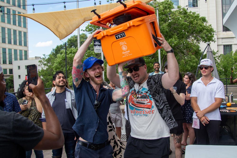 Grant McCloskey, the bar manager at The Hollow on Gervais, displays his prize after winning the competition on June 9, 2024. As one of the two winners, McCloskey received an array of cocktail ingredients packaged in a Yeti cooler.