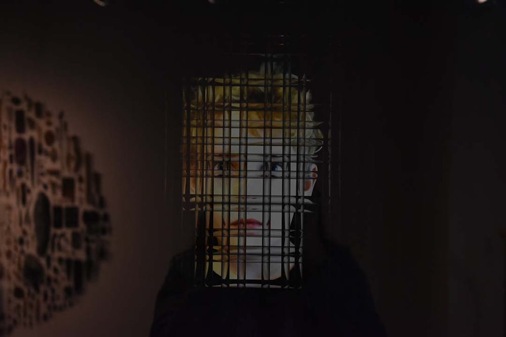 "Perceptual Interface" by Eli Kessler is constructed of a server network cabinet, video, monitors, an optical grid and a cooling fan. The work involves a recording-like avatar that has minimal movement, creating an eerie atmosphere.