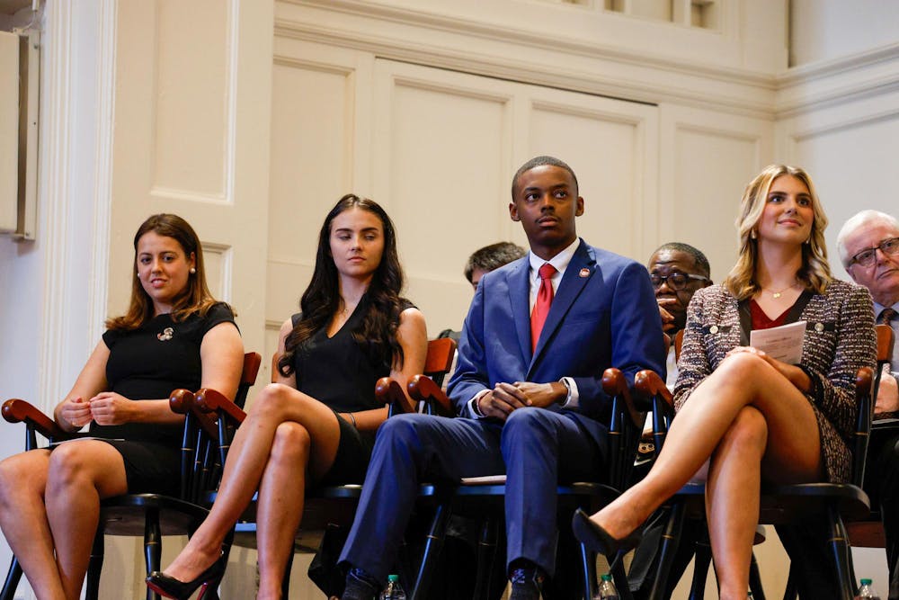 Maura Hamilton, Ashley Reynolds, Jordan Richardson and Courtney Tkacs sit together on the stage at Rutledge Chapel during the Student Government Inauguration on March 20, 2025. Richardson and Reynolds are new members of the executive leadership while Tkacs and Hamilton both previously served as vice president and speaker of the student senate respectively.