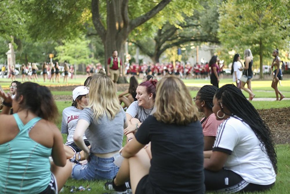 Students laugh and talk as they wait for "First Night Carolina" festivities to begin on the horseshoe, Wednesday evening.