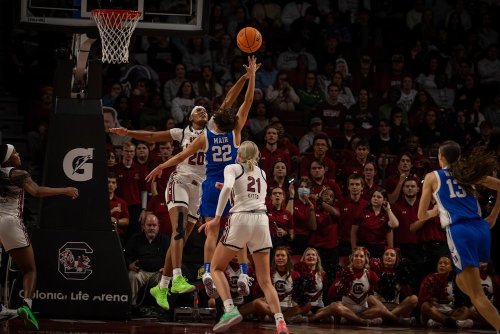 Senior forward Sania Feagin blocks a shot from a Duke player on Dec. 5, 2024. Feagin had two blocks and one rebound.