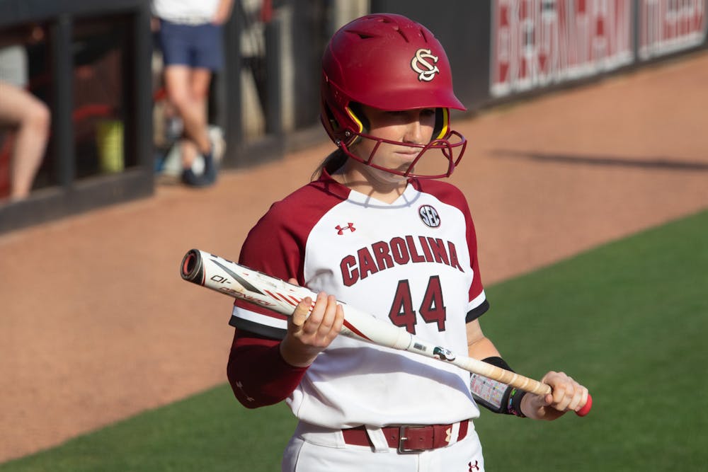 Sophomore infielder Emma Sellers prepares to bat against Charleston Southern on April 19, 2023. The Gamecocks beat the Buccaneers for the second time in the day, winning 11-2 after five innings.