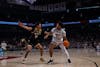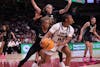 FILE — Senior guard Ta'Niya Latson holds the ball during the Gamecocks’ matchup with Vanderbilt at Colonial Life Arena on Jan. 25. She looks for room to move while defenders close in around her.
