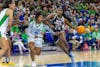 FILE — Senior guard Raven Johnson drives the ball down the court while flanked by an opposing player during the game at Florida Gulf Coast University on Dec. 20, 2025. The Gamecocks defeated the Eagles 105-43