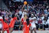 Senior center Madina Okot attempts to grab the ball while flanked from behind by two opposing players during the game against Georgia on Jan. 11, 2026. Okot tied with sophomore forward Joyce Edwards for most points with 14 each.