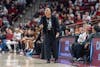 South Carolina women's basketball coach Dawn Staley shouts from the sidelines during the game against Georgia on Jan. 11, 2026. This is Staley's 18th season with the Gamecocks.