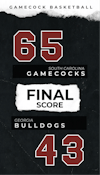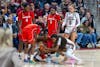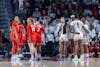 Players from the South Carolina and Georgia women's basketball teams gather in separate huddles on the court during a game at Colonial Life Arena on Jan. 11, 2026. The Gamecocks defeated the Bulldogs 65-43.