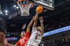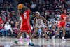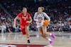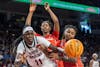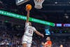 FILE — Senior guard Mike Sharavjamts dribbles the ball around an opposing player during the game against Charleston Southern University on Nov. 28, 2025. Sharavjamts has averages a career high 53.6% field goal rate during his first season with the Gamecocks.