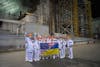 A team of veterinarians, veterinarian technicians and scientists at Chernobyl are in front of the old reactor and its deteriorating sarcophagus. Scientists hold the flags of the United States and Ukraine to represent their works.