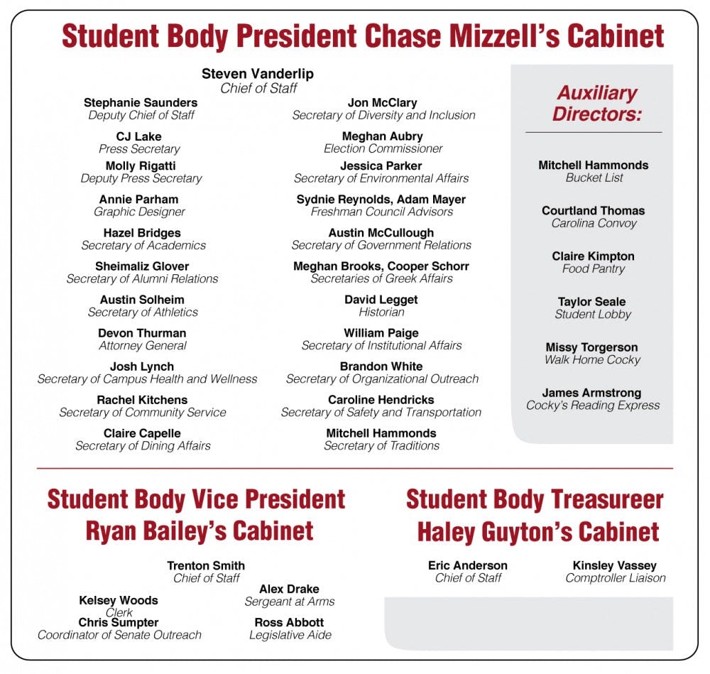After vetting 56 applicants for top Student Government positions, Student Body President Chase Mizzell has selected all but one member of his executive cabinet.