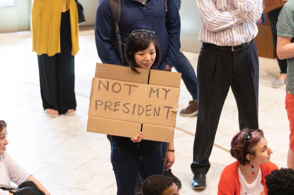 Protesters met the trustees outside of the boardroom with frustration and chanting following Caslen's election.