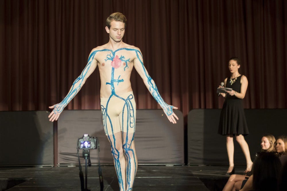 USC's medical fraternity showcased the human body through various models with hand-painted anatomical systems covering their bodies at an event Monday, raising money for Columbia's local Children's Miracle Network hospital.
