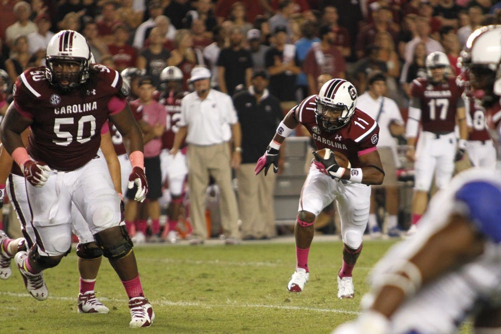 South Carolina’s successful running game helped limit Arkansas to just 37 plays in the Gamecocks’ 52-7 victory Saturday. On 54 attempts, the Gamecocks put up 277 rushing yards, averaging around five yards a carry. Once again, sophomore running back Mike Davis led the rushing attack, finishing the day with 128 yards on 19 carries to go along with a touchdown. Davis now leads the SEC in rushing with 742 yards and is tied for the conference lead with nine rushing touchdowns.