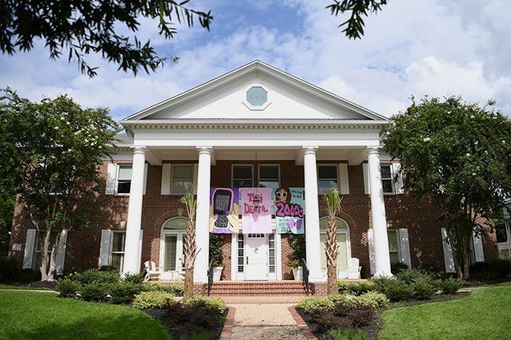 University of South Carolina students hold a transgender pride flag and a Black Lives Matter flag in front of protestors on campus on Aug. 26, 2020.