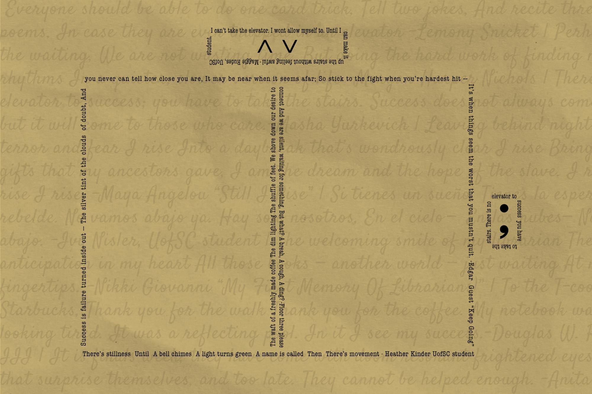 USC's community-focused English 200 class posted poems around campus and the Columbia area for public viewing. The poems were placed in well-trafficked public places to promote self-reflection and create a sense of disruption from the normal routine for a variety of viewers.