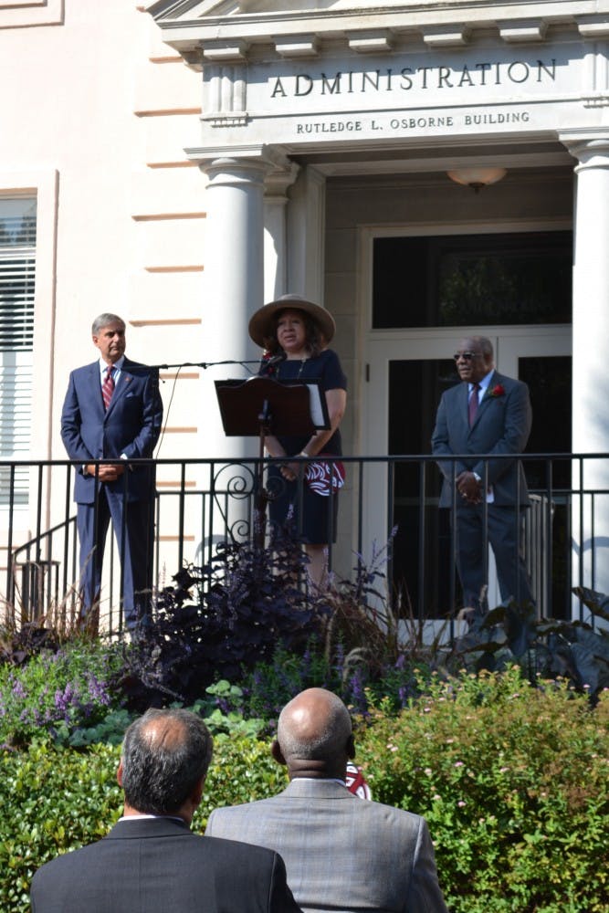 University President Harris Pastides walks with Henrie Monteith Treadwell and James Solomon Jr. to the site of the future desegregation reflection garden.