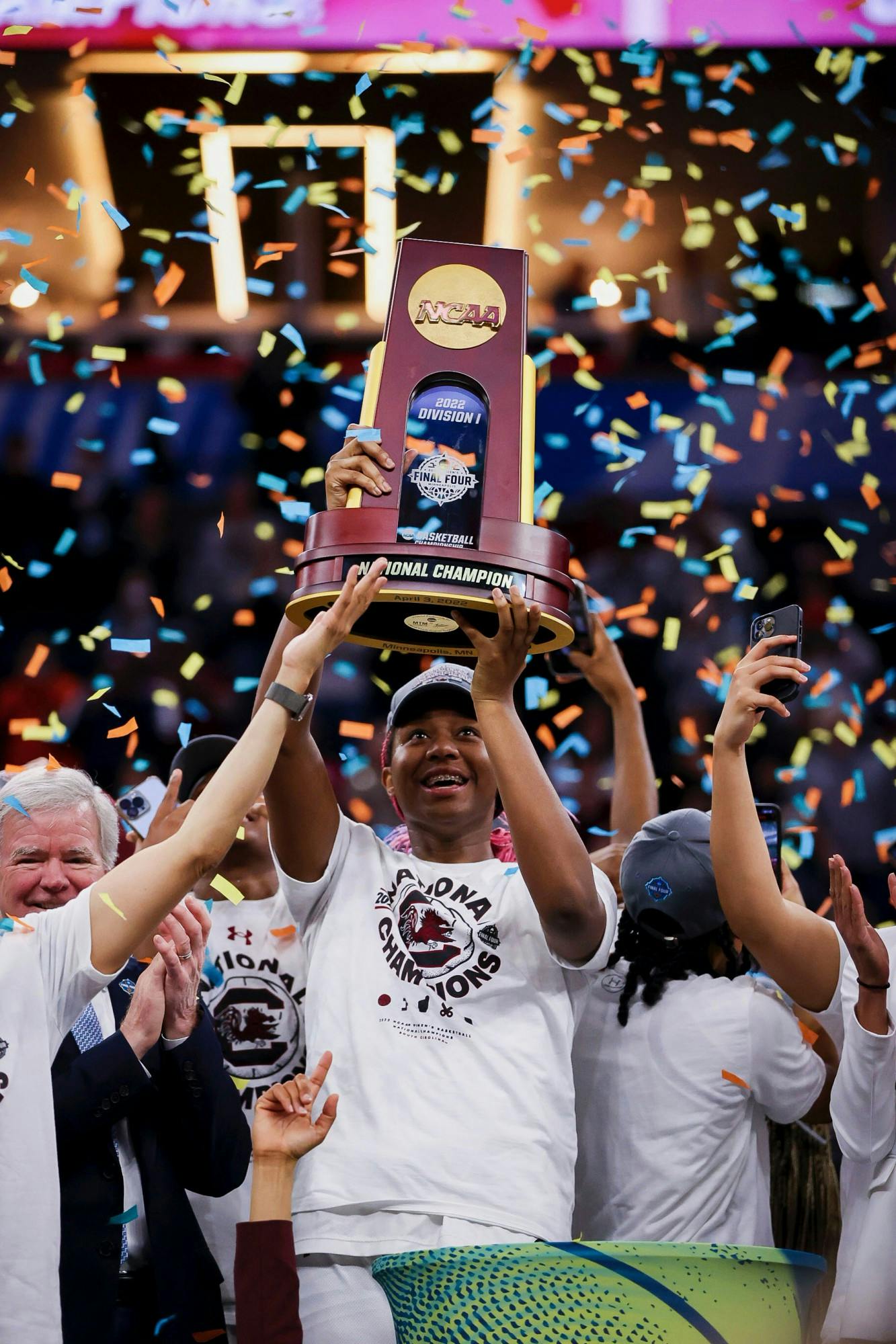 The South Carolina women's basketball team celebrates its national championship win against UConn on April 3, 2022. Since the win, two Gamecocks have announced plans to enter the transfer portal and one transfer guard committed to South Carolina.